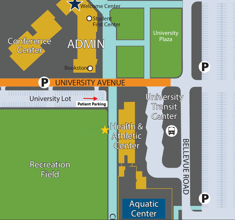 Patient Parking is designated in the University Lot immediately behind the Health Center. Please obtain a parking pass upon arrival from the front desk to display on your dashboard.
